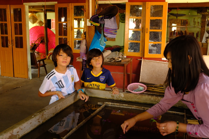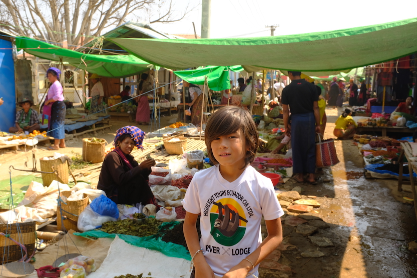 Mardi 3 mars, après 7 heures de route fatigante, entre les camions et les routes non goudronnées, nous arrivons à destination dans le ville de Nyaung Shwe au nord du lac Inle. Nous nous y installons pour une nuit seulement. Julien et les enfants iront dîner, Julien goûtera à la fameuse salade de feuilles de thé, moi je resterai dans la chambre à me reposer.