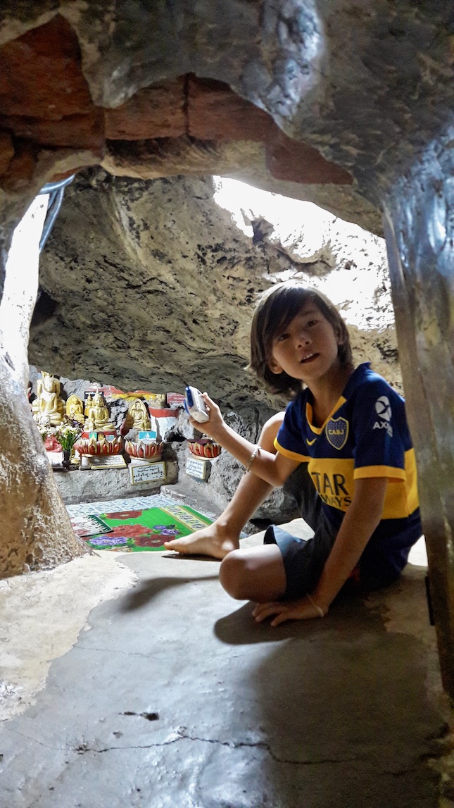 Nous arrivons dans la grotte. On voit plein de Bouddhas en or. Et même un trou dans la roche, il y a de la lumière, on entre dedans tous les 4. Papa avait du mal à rentrer. On avait mis nos chaussures au mauvais endroit, papa a été obligé d'aller les chercher. Enfin, c'était très beau.